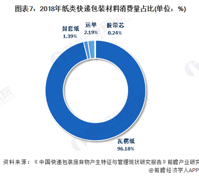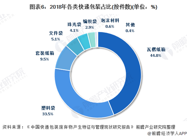 快遞包裝的主要材料包括瓦楞紙箱、塑料袋、膠帶、快遞運(yùn)單及填充物等。根據(jù)環(huán)保組織綠色和平、擺脫塑縛與中華環(huán)保聯(lián)合會(huì)聯(lián)合發(fā)布的《中國快遞包裝廢棄物產(chǎn)生特征與管理現(xiàn)狀研究報(bào)告》調(diào)查數(shù)據(jù)顯示,2018年,中國快遞包裝主要以瓦楞紙箱和塑料袋為主。其中瓦楞紙箱占占44.0%(按件數(shù)),塑料袋占33.5%。