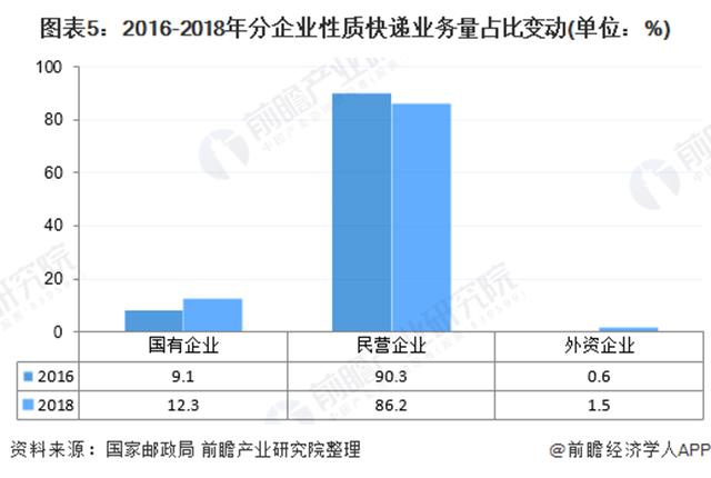 從企業(yè)性質(zhì)來看,近年來民營企業(yè)快遞業(yè)務(wù)量占比有所下滑。2018年,民營企業(yè)快遞業(yè)務(wù)量占總快遞量的86.2%,較2016年下降4.1個(gè)百分點(diǎn)。國有企業(yè)及外資企業(yè)快遞業(yè)務(wù)量占比有所上升。