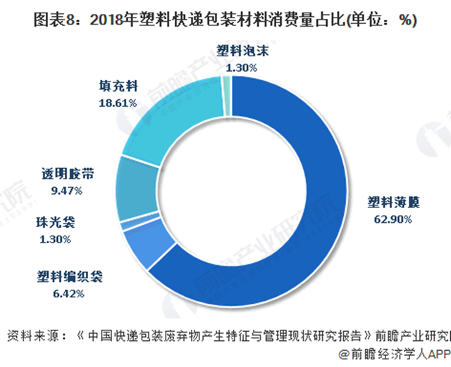 其中紙質(zhì)包裝以瓦楞紙為主,占比高達(dá)96.18%;塑料類包裝材料主要包括塑料袋薄膜(不包括珠光袋和填充薄膜塑料)、編織袋、泡沫箱、珠光袋、膠帶和填充塑料等,其中普通塑料袋薄膜占比最高,質(zhì)量占比達(dá)62.90%。對(duì)于快遞塑料袋薄膜,約占質(zhì)量比例的80%是由廢料再生的,其廢棄物容易造成環(huán)境污染。