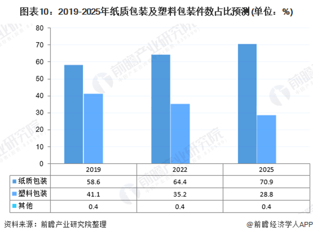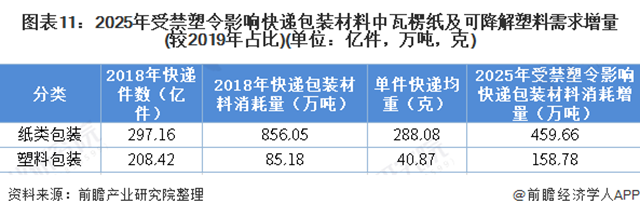 紙質(zhì)包裝快遞中,瓦楞紙使用占比為96.18%,按單件紙質(zhì)包裝快遞為288.08克,單件塑料包裝40.87克測算,2025年,受禁塑令影響,用于快遞包裝的瓦楞紙潛在需求增量為459.66萬噸,可降解塑料潛在需求增量為158.78萬噸。