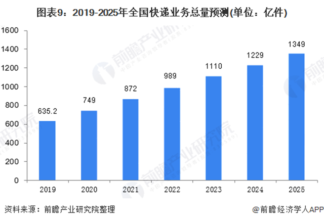 根據(jù)近幾年中國快遞業(yè)務(wù)量增速測算,到2025年,中國快遞業(yè)務(wù)量將達(dá)到1349億件,年復(fù)合增長率為13.4%。