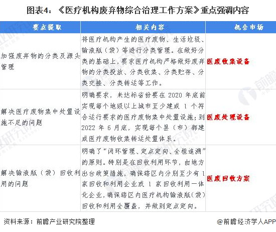 通過對該文件核心要點的解讀,可以看出未來與醫(yī)廢處理相關(guān)的醫(yī)廢處理設(shè)施、醫(yī)廢收集工具、醫(yī)廢回收利用方案等領(lǐng)域存在較大市場機會。