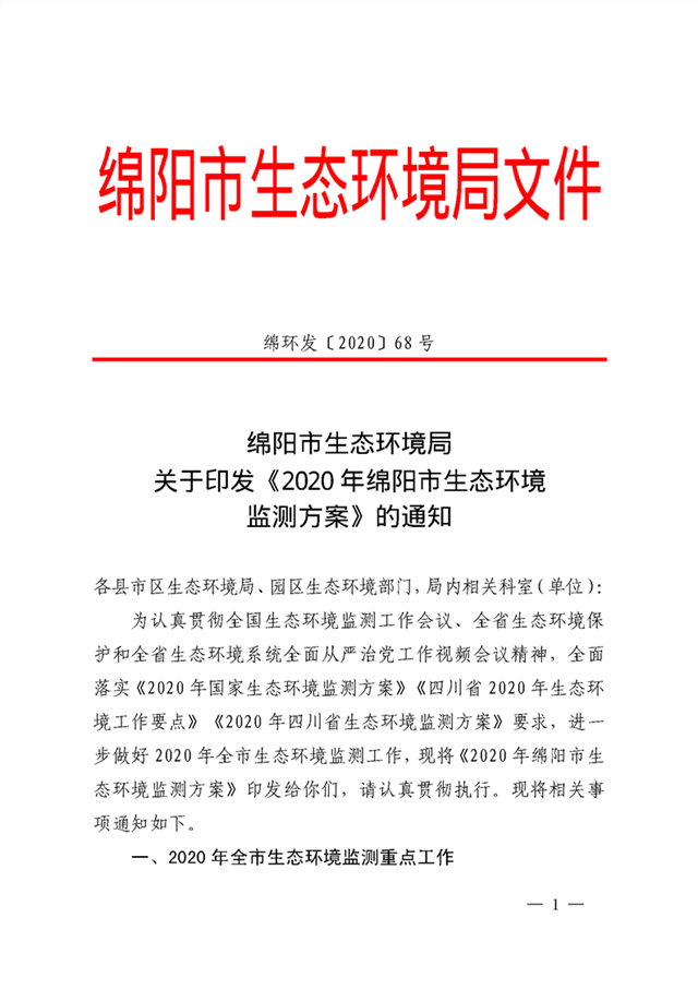 綿陽市生態(tài)環(huán)境局關(guān)于印發(fā)《2020年綿陽市生態(tài)環(huán)境監(jiān)測方案》的通知