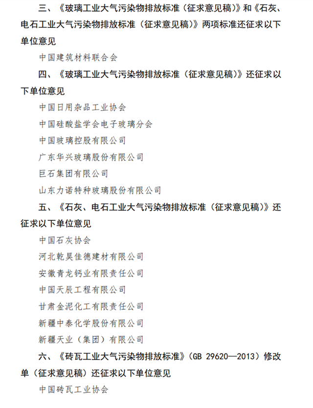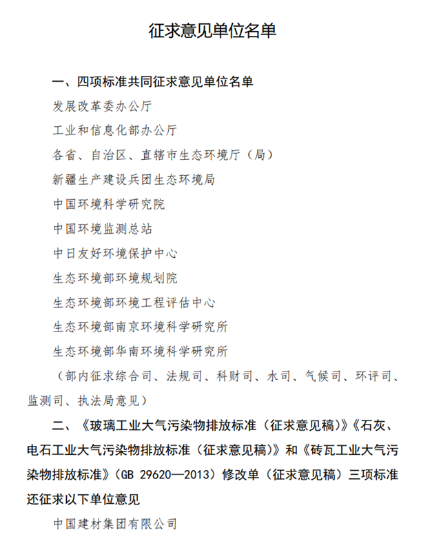 為貫徹《中華人民共和國(guó)環(huán)境保護(hù)法》和《中華人民共和國(guó)大氣污染防治法》,完善國(guó)家大氣污染物排放標(biāo)準(zhǔn),促進(jìn)環(huán)境空氣質(zhì)量改善,我部組織起草了國(guó)家環(huán)境保護(hù)標(biāo)準(zhǔn)《玻璃工業(yè)大氣污染物排放標(biāo)準(zhǔn)(征求意見(jiàn)稿)》《石灰、電石工業(yè)大氣污染物排放標(biāo)準(zhǔn)(征求意見(jiàn)稿)》《磚瓦工業(yè)大氣污染物排放標(biāo)準(zhǔn)》(GB 29620—2013)修改單(征求意見(jiàn)稿)和《無(wú)機(jī)化學(xué)工業(yè)污染物排放標(biāo)準(zhǔn)》(GB 31573—2015)修改單(征求意見(jiàn)稿)。根據(jù)《國(guó)家環(huán)境保護(hù)標(biāo)準(zhǔn)制修訂工作管理辦法》,現(xiàn)就標(biāo)準(zhǔn)征求你單位意見(jiàn),請(qǐng)研究提出書(shū)面意見(jiàn),并于2020年5月22日前反饋我部(電子文檔請(qǐng)同時(shí)發(fā)送至電子郵箱)。標(biāo)準(zhǔn)征求意見(jiàn)稿和編制說(shuō)明可登錄我部網(wǎng)站(http://www.mee.gov.cn/)“意見(jiàn)征集”欄目檢索查閱。