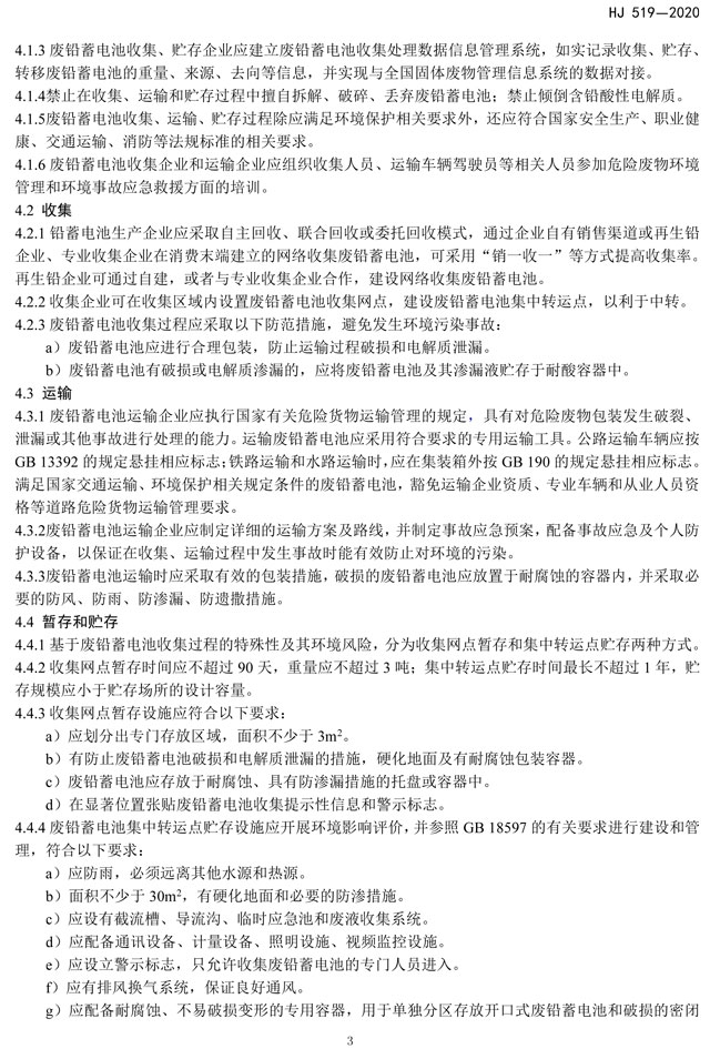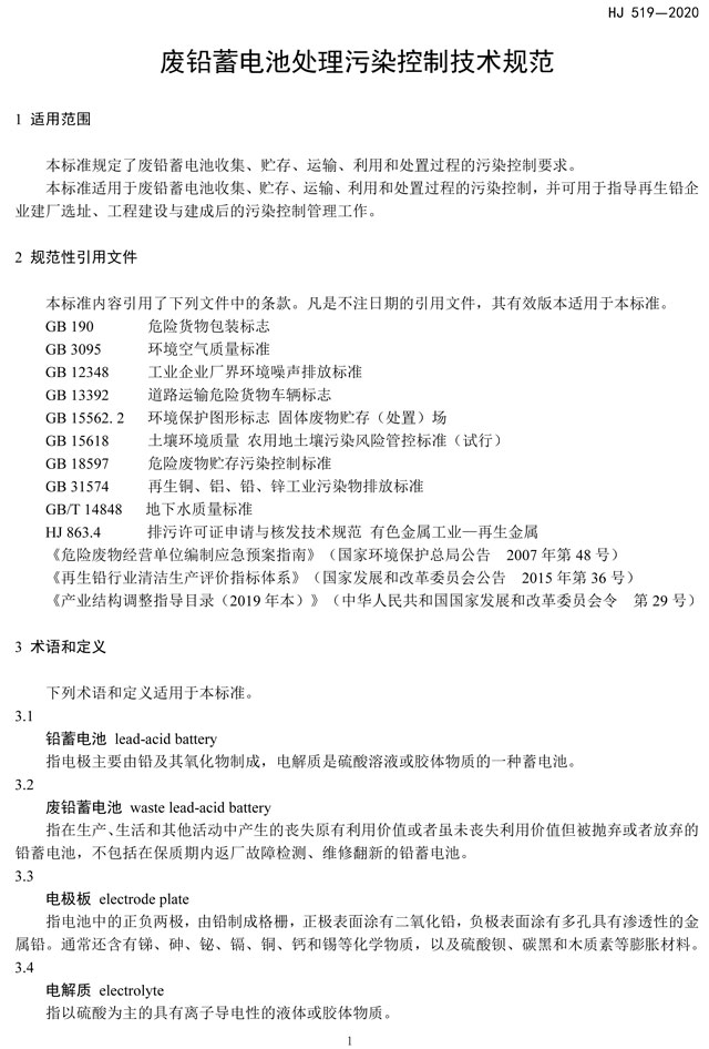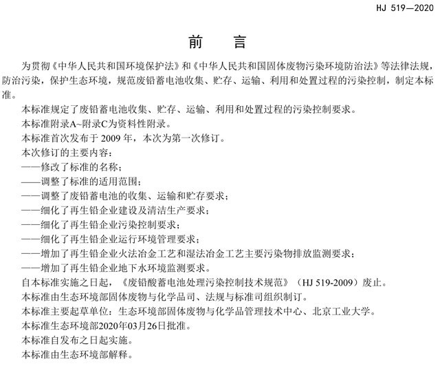 廢鉛蓄電池處理污染控制技術(shù)規(guī)范(HJ 519——2020 代替 HJ 519-2009)