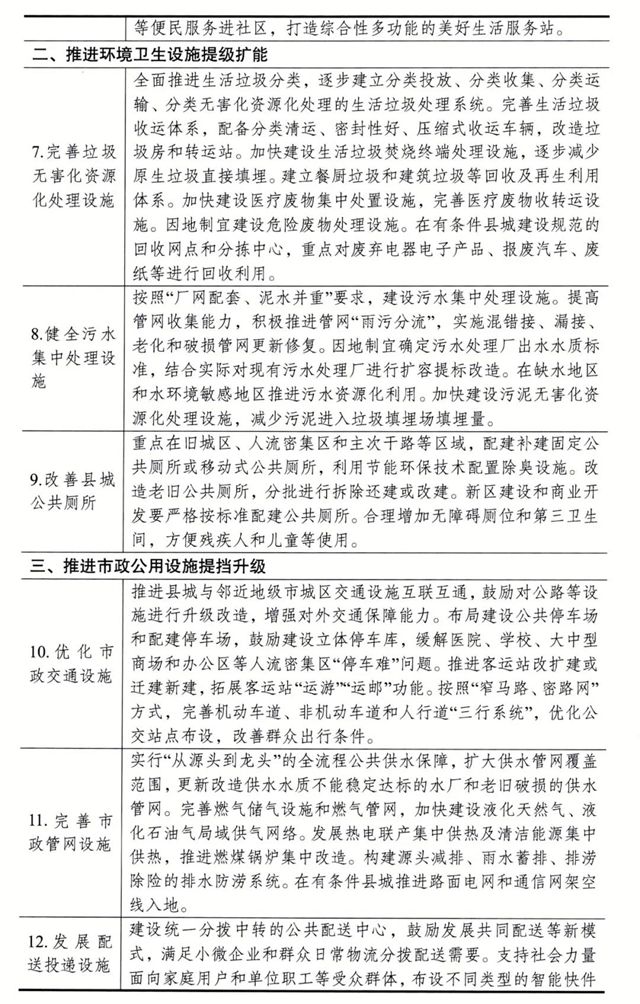(二)明晰建設(shè)領(lǐng)域。各地區(qū)要瞄準(zhǔn)市場(chǎng)不能有效配置資源、需要政府支持引導(dǎo)的公共領(lǐng)域,聚力推進(jìn)17項(xiàng)建設(shè)任務(wù)。圍繞公共服務(wù)設(shè)施提標(biāo)擴(kuò)面,優(yōu)化醫(yī)療衛(wèi)生設(shè)施、教育設(shè)施、養(yǎng)老托育設(shè)施、文旅體育設(shè)施、社會(huì)福利設(shè)施和社區(qū)綜合服務(wù)設(shè)施。圍繞環(huán)境衛(wèi)生設(shè)施提級(jí)擴(kuò)能,完善垃圾無害化資源化處理設(shè)施、污水集中處理設(shè)施和縣城公共廁所。圍繞市政公用設(shè)施提擋升級(jí),推進(jìn)市政交通設(shè)施、市政管網(wǎng)設(shè)施、配送投遞設(shè)施、老舊小區(qū)更新改造和縣城智慧化改造。圍繞產(chǎn)業(yè)培育設(shè)施提質(zhì)增效,完善產(chǎn)業(yè)平臺(tái)配套設(shè)施、冷鏈物流設(shè)施和農(nóng)貿(mào)市場(chǎng)。