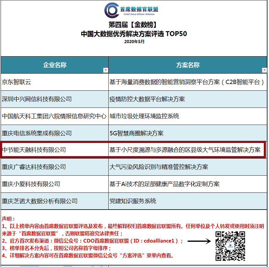 近日,由首席數據官聯盟發(fā)起的第四屆【金數榜】中國大數據優(yōu)秀解決方案及案例TOP50評選活動正式公布評選結果,中節(jié)能天融科技有限公司(以下簡稱“天融科技”)憑借“基于小尺度溯源與多源融合的區(qū)縣級大氣環(huán)境監(jiān)管解決方案”入選中國大數據優(yōu)秀解決方案TOP50。