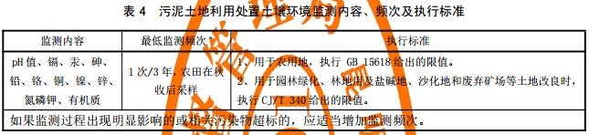 污泥填埋處置的,應(yīng)按GB 18599、GB 16889開(kāi)展環(huán)境影響跟蹤監(jiān)測(cè);污泥土地利用處置的,處置過(guò)程結(jié)束后應(yīng)按表5開(kāi)展環(huán)境影響跟蹤監(jiān)測(cè),監(jiān)測(cè)周期不應(yīng)低于10年;采用其他處置方式時(shí),則執(zhí)行與其對(duì)應(yīng)的相關(guān)標(biāo)準(zhǔn)。