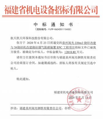 在6月到7月間,連續(xù)中標(biāo)甘肅通渭縣生活垃圾處理系統(tǒng)設(shè)備采購項(xiàng)目、金鼎重工有限公司1#燒結(jié)機(jī)濕式電除塵器項(xiàng)目、金鼎重工有限公司白灰窯煙氣脫硝項(xiàng)目、福建三鋼閩光股份有限公司動力廠278th鍋爐煙氣增加SCR脫硝裝置及煙道換熱設(shè)備改造工程項(xiàng)目、泉州閩光220m²燒結(jié)改建與5#燒結(jié)機(jī)改建燒結(jié)煙氣脫硝裝置EPC工程項(xiàng)目、安陽市新普鋼鐵有限公司固定床脫硫脫硝改造SDS+布袋除塵燃煤氣鍋爐爐內(nèi)SCR脫硝改造環(huán)保升級項(xiàng)目等6個項(xiàng)目,合計(jì)中標(biāo)額1.95548億元,其中泉州閩光220m²燒結(jié)改建與5#燒結(jié)機(jī)改建燒結(jié)煙氣脫硝裝置EPC工程,中標(biāo)金額12818.8萬元,刷新了航天凱天環(huán)保大氣環(huán)境治理業(yè)務(wù)單個合同金額,也為企業(yè)在鋼鐵行業(yè)煙氣治理領(lǐng)域再樹典型業(yè)績。