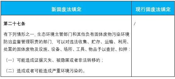 4.明確了對違法收集、貯存、運輸、利用、處置的固體廢物及設(shè)施、設(shè)備、場所、工具、物品予以查封、扣押的規(guī)定