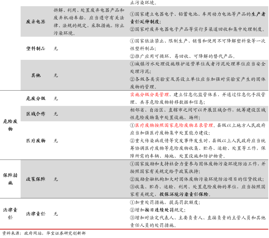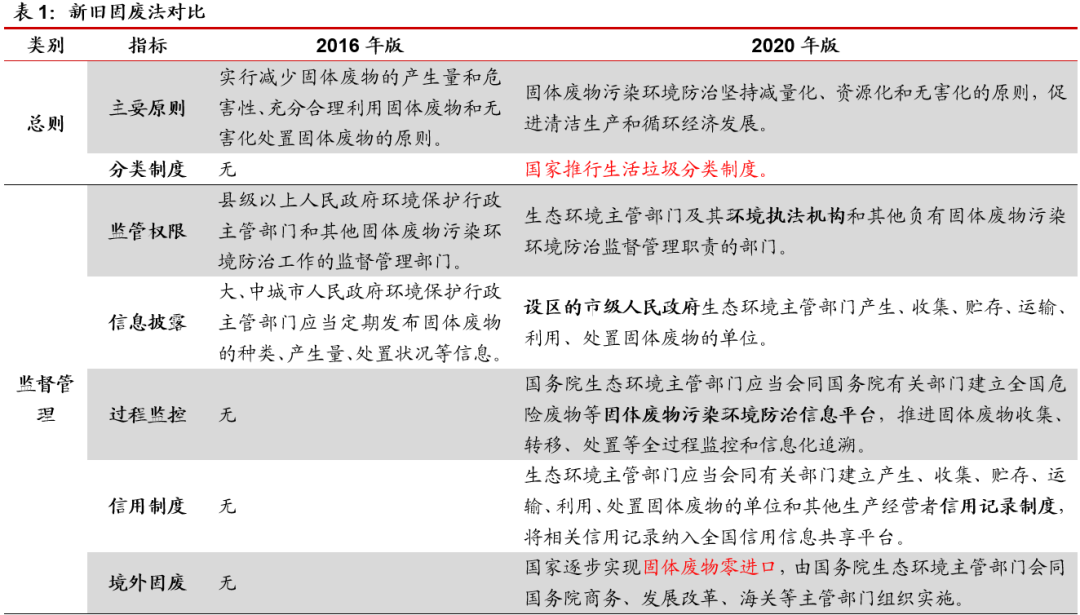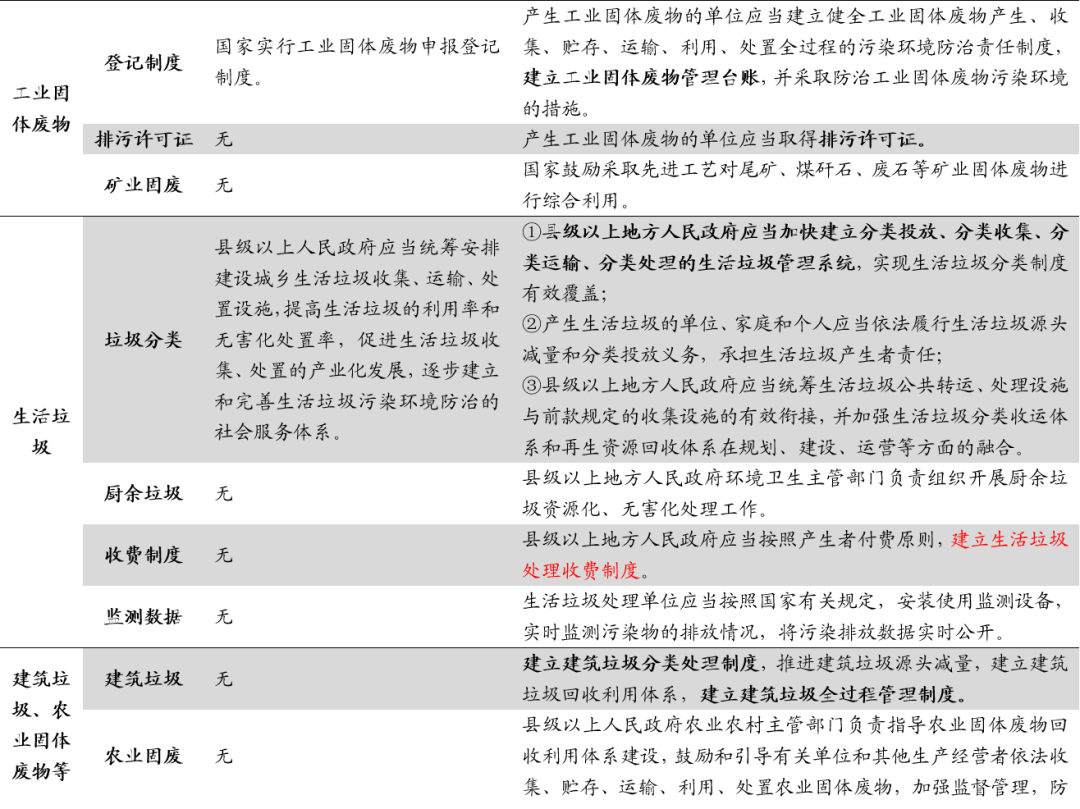 從具體內(nèi)容上來看,相較于2016年修正版,新固廢法新增垃圾分類、污泥、建筑垃圾、醫(yī)療廢物、塑料制品等相關(guān)內(nèi)容。垃圾分類方面:推行生活垃圾分類制度,建立差別化生活垃圾處理收費(fèi)制度。將垃圾分類寫入新固廢法中,明確責(zé)任主體和收費(fèi)制度,解決政策端和費(fèi)用端兩大限制問題,為垃圾分類的順利開展提供保障。具體來看,1)新固廢法提出國家推行生活垃圾分類制度,要求縣級以上地方人民政府應(yīng)當(dāng)加快建立分類投放、分類收集、分類運(yùn)輸、分類處理的生活垃圾管理系統(tǒng),實(shí)現(xiàn)生活垃圾分類制度有效覆蓋;2)縣級以上地方人民政府應(yīng)當(dāng)按照產(chǎn)生者付費(fèi)原則,建立生活垃圾處理收費(fèi)制度,縣級以上地方人民政府制定生活垃圾處理收費(fèi)標(biāo)準(zhǔn),應(yīng)當(dāng)根據(jù)本地實(shí)際,結(jié)合生活垃圾分類情況,體現(xiàn)分類計(jì)價(jià)、計(jì)量收費(fèi)等差別化管理。污泥處理方面:關(guān)注污泥處理,促進(jìn)污水污泥處理系統(tǒng)協(xié)同發(fā)展。污水處理過程中常有“重水輕泥”等問題,污泥處理技術(shù)較弱,新固廢法將污泥處理管理列入監(jiān)管范圍,明確污泥處理標(biāo)準(zhǔn),從而促進(jìn)污泥穩(wěn)定化、減量化和無害化處理。具體來看,1)城鎮(zhèn)污水處理設(shè)施維護(hù)運(yùn)營單位或者污泥處理單位應(yīng)當(dāng)安全處理污泥,保證處理后的污泥符合國家有關(guān)標(biāo)準(zhǔn),對污泥的流向、用途、用量等進(jìn)行跟蹤、記錄,并報(bào)告城鎮(zhèn)排水主管部門、生態(tài)環(huán)境主管部門。縣級以上人民政府城鎮(zhèn)排水主管部門應(yīng)當(dāng)將污泥處理設(shè)施納入城鎮(zhèn)排水與污水處理規(guī)劃,推動同步建設(shè)污泥處理設(shè)施與污水處理設(shè)施,鼓勵協(xié)同處理,污水處理費(fèi)征收標(biāo)準(zhǔn)和補(bǔ)償范圍應(yīng)當(dāng)覆蓋污泥處理成本和污水處理設(shè)施正常運(yùn)營成本。2)禁止擅自傾倒、堆放、丟棄、遺撒城鎮(zhèn)污水處理設(shè)施產(chǎn)生的污泥和處理后的污泥。建筑垃圾方面:建立建筑垃圾分類處理和全過程管理制度。新固廢法將建筑垃圾單獨(dú)提出,有利于其實(shí)現(xiàn)獨(dú)立管理,促進(jìn)我國促進(jìn)我國建筑垃圾分類處理、回收利用、全過程管理的制度和體系的建立。具體來看,1)縣級以上地方人民政府應(yīng)當(dāng)加強(qiáng)建筑垃圾污染環(huán)境的防治,建立建筑垃圾分類處理制度;2)縣級以上地方人民政府環(huán)境衛(wèi)生主管部門負(fù)責(zé)建筑垃圾污染環(huán)境防治工作,建立建筑垃圾全過程管理制度,規(guī)范建筑垃圾產(chǎn)生、收集、貯存、運(yùn)輸、利用、處置行為,推進(jìn)綜合利用,加強(qiáng)建筑垃圾處置設(shè)施、場所建設(shè),保障處置安全,防止污染環(huán)境。醫(yī)療廢物方面:新增醫(yī)療廢物管理機(jī)制,加強(qiáng)醫(yī)廢集中處置能力。疫情引發(fā)公眾對于醫(yī)療廢物處理處置的關(guān)注,也暴露出醫(yī)廢處理處置能力上的缺口,新固廢法新增醫(yī)療廢物管理的相關(guān)規(guī)定,從法律層面補(bǔ)足短板,促進(jìn)未來管理的規(guī)范化和處置能力的進(jìn)一步提升。具體來看,1)明確醫(yī)療廢物按照國家危險(xiǎn)廢物名錄管理:“縣級以上地方人民政府應(yīng)當(dāng)加強(qiáng)醫(yī)療廢物集中處置能力建設(shè)”;2)明確監(jiān)管職責(zé):“縣級以上人民政府衛(wèi)生健康、生態(tài)環(huán)境等主管部門應(yīng)當(dāng)在各自職責(zé)范圍內(nèi)加強(qiáng)對醫(yī)療廢物收集、貯存、運(yùn)輸、處置的監(jiān)督管理,防止危害公眾健康、污染環(huán)境”;3)突出主體責(zé)任:“醫(yī)療衛(wèi)生機(jī)構(gòu)應(yīng)當(dāng)依法分類收集本單位產(chǎn)生的醫(yī)療廢物,交由醫(yī)療廢物集中處置單位處置。醫(yī)療廢物集中處置單位應(yīng)當(dāng)及時(shí)收集、運(yùn)輸和處置醫(yī)療廢物;醫(yī)療衛(wèi)生機(jī)構(gòu)和醫(yī)療廢物集中處置單位,應(yīng)當(dāng)采取有效措施,防止醫(yī)療廢物流失、泄漏、滲漏、擴(kuò)散。”;4)完善應(yīng)急保障機(jī)制:“重大傳染病疫情等突發(fā)事件發(fā)生時(shí),縣級以上人民政府應(yīng)當(dāng)統(tǒng)籌協(xié)調(diào)醫(yī)療廢物等危險(xiǎn)廢物收集、貯存、運(yùn)輸、處置等工作,保障所需的車輛、場地、處置設(shè)施和防護(hù)物資?!薄?/span>危險(xiǎn)廢物方面:實(shí)施危廢分級分類管理,鼓勵區(qū)域合作集中處置。新固廢法首次提出危廢實(shí)施分級分類管理,對于部分危廢的部分環(huán)節(jié)實(shí)行豁免管理,為危廢分級提供法律依據(jù),在規(guī)范化管理的前提下進(jìn)一步提升危廢處理處置效率,此外,區(qū)域合作處置措施的推進(jìn)也將進(jìn)一步解決危廢處置產(chǎn)能錯配等結(jié)構(gòu)性問題。具體來看,1)新增分級管理:“國務(wù)院生態(tài)環(huán)境主管部門根據(jù)危險(xiǎn)廢物的危害特性和產(chǎn)生數(shù)量,科學(xué)評估其環(huán)境風(fēng)險(xiǎn),實(shí)施分級分類管理,建立信息化監(jiān)管體系,并通過信息化手段管理、共享危險(xiǎn)廢物轉(zhuǎn)移數(shù)據(jù)和信息”;2)鼓勵區(qū)域合作:“