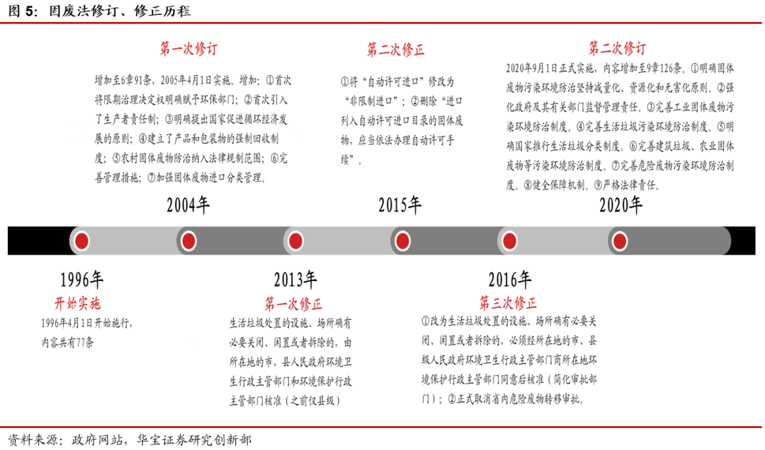 新固廢法將于9月正式實(shí)施,推動固廢全產(chǎn)業(yè)鏈發(fā)展。第十三屆全國人民代表大會常務(wù)委員會第十七次會議于2020年4月29日修訂通過《中華人民共和國固體廢物污染環(huán)境防治法》(簡稱新固廢法),自2020年9月1日正式實(shí)施。我國固廢法于1996年4月1日正式實(shí)施,2004年進(jìn)行了第一次修訂,引入生產(chǎn)者責(zé)任制,2013年、2015年、2016年先后進(jìn)行了三次修正,本次是固廢法時(shí)隔15年的第二次修訂。本次修訂版內(nèi)容由原先的六章91條增加至九章126條,2020年修訂版在2016年版的基礎(chǔ)上,細(xì)化工業(yè)固體廢物、生活垃圾、危險(xiǎn)廢物的相關(guān)規(guī)定,新增建筑垃圾、農(nóng)業(yè)固體廢物及保障措施的相關(guān)內(nèi)容。新固廢法對固體廢物產(chǎn)生、收集、貯存、運(yùn)輸、利用、處置全過程提出更高的防治要求,將進(jìn)一步帶動固廢行業(yè)的穩(wěn)健可持續(xù)發(fā)展。