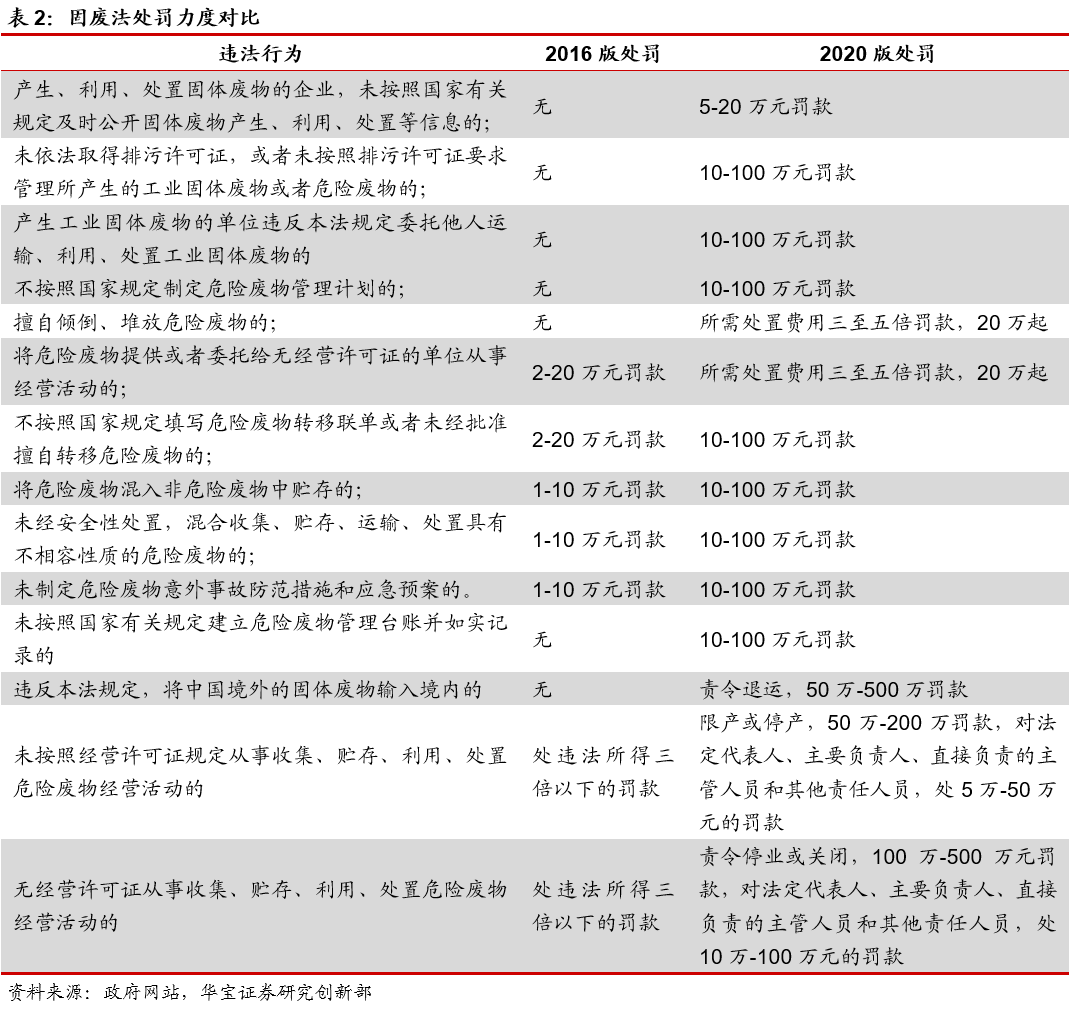新固廢法嚴(yán)懲重罰,大幅提高違法成本。新固廢法除細(xì)化完善固體廢物的相關(guān)管理制度外,還嚴(yán)格落實(shí)法律責(zé)任,增加罰款種類、加大處罰力度、提高處罰額度。具體來看,1)對于相關(guān)違法行為,新固廢法加重處罰措施,提高罰款額度,最高可罰款500萬元,且多項(xiàng)違法行為的罰款額度是原固廢法的十倍;2)新固廢法增加按日連續(xù)處罰規(guī)定,對于違法受罰單位和其他生產(chǎn)經(jīng)營者,被發(fā)現(xiàn)其繼續(xù)實(shí)施該違法行為的,實(shí)行按日連續(xù)處罰;3)新固廢法實(shí)行“雙罰制”,對于特定的違法行為,除對企業(yè)本身進(jìn)行行政處罰外,同時(shí)對企業(yè)的相關(guān)負(fù)責(zé)人進(jìn)行處罰。