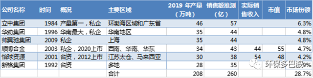 2019年國內(nèi)再生鋁產(chǎn)量達(dá)725萬噸,前六大企業(yè)產(chǎn)能占比約29%,六大企業(yè)銷售額約260億。