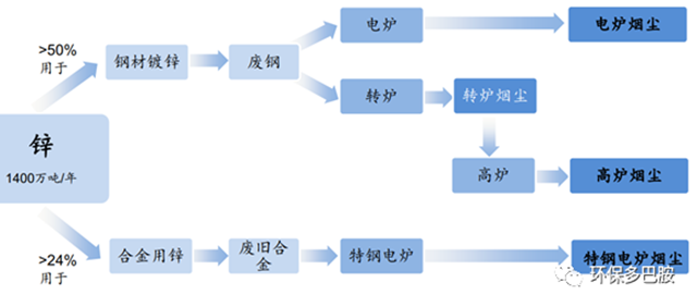相比其他三大基本有色金屬(銅、鋁、鉛),鋅更加難以回收,再生率很低。鋅具有極高的防腐蝕性,因此其最大用途是鍍鋅工業(yè),鋼材鍍鋅、合金用鋅分別占鋅消費(fèi)的50%和24%以上,均需通過鋼鐵煙塵(高爐瓦斯灰)回收。這方面以鑫聯(lián)環(huán)保為代表。