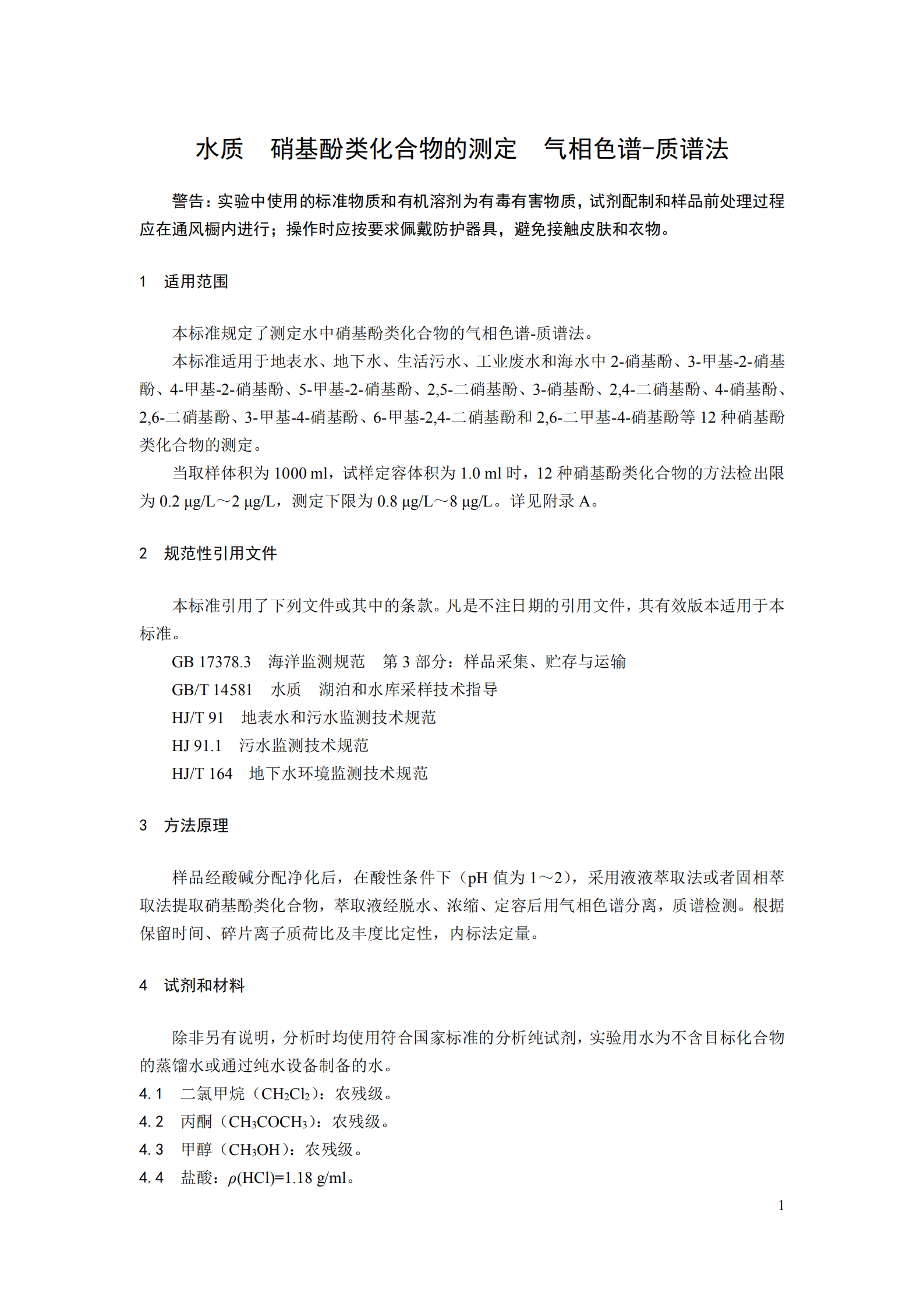 本標(biāo)準(zhǔn)規(guī)定了測定地表水、地下水、生活污水、工業(yè)廢水和海水中12種硝基酚類化合物 的氣相色譜-質(zhì)譜法。