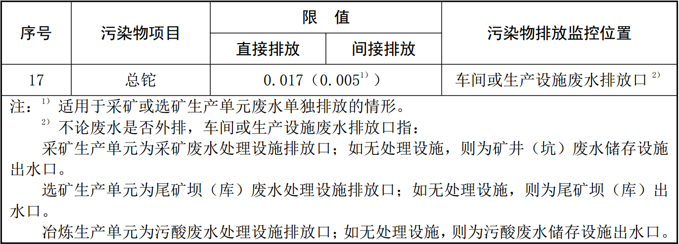 二、在“表 2 新建企業(yè)水污染物排放濃度限值及單位產品基準排水量”“表 3 水污染物特別排放限值”中,增加總鉈排放限值要求(單位為 mg/L):
