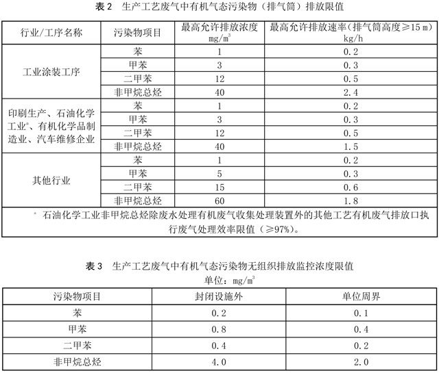 5.2.2 生產(chǎn)工藝廢氣中有機(jī)氣態(tài)污染物排氣筒、無(wú)組織排放監(jiān)控濃度限值分別按表2、表3的規(guī)定執(zhí)行。