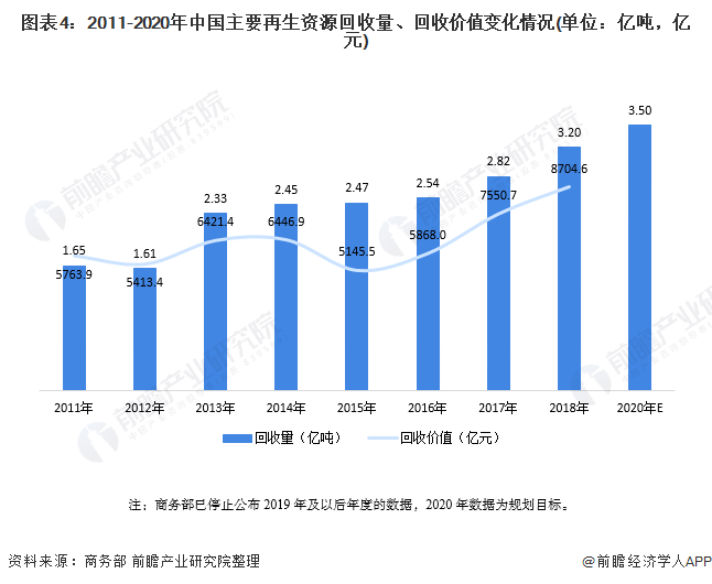 此外,根據(jù)工信部、商務(wù)部、科技部發(fā)布的《關(guān)于加快推進(jìn)再生資源產(chǎn)業(yè)發(fā)展的指導(dǎo)意見》中提出的發(fā)展目標(biāo),到2020年,全國再生資源回收利用量達(dá)到3.5億噸。