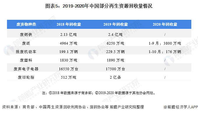 同時(shí),根據(jù)資料的公開程度,前瞻整理了2019-2020年部分再生資源的回收情況,可以看出,與2018年相比,2019年廢棄物的回收量都有所增加,一定程度上說明行業(yè)的回收經(jīng)營情況較為穩(wěn)定: