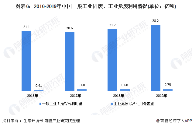 另從加工處置的角度來看,據(jù)生態(tài)環(huán)境部的統(tǒng)計(jì)數(shù)據(jù)顯示,2015-2019年,全國一般工業(yè)固廢和工業(yè)廢物的綜合利用量總體上升。2019年,全國一般工業(yè)固廢的綜合利用量為23.2億噸,工業(yè)危廢的綜合利用處置量為0.75億噸。