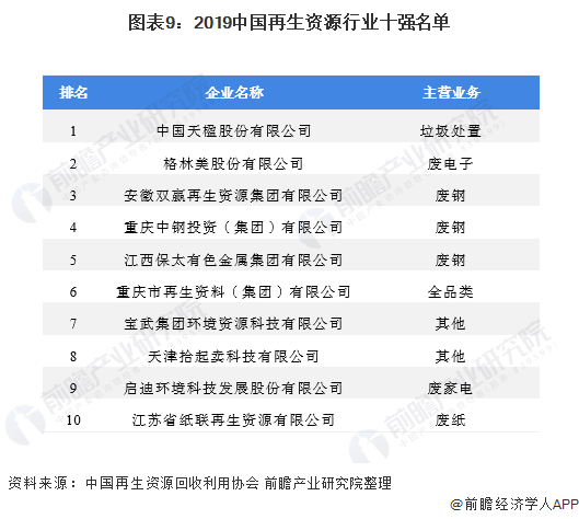 在企業(yè)競爭格局方面,由于再生資源行業(yè)的業(yè)務(wù)范圍廣,行業(yè)的競爭者數(shù)量較多,但根據(jù)廢棄物種類的不同,各個(gè)企業(yè)的重點(diǎn)業(yè)務(wù)有所不同。2020年12月末,中國再生資源回收利用協(xié)會(huì)公布了《2019年中國再生資源行業(yè)50強(qiáng)榜單》,其中,TOP10企業(yè)的排名情況如下,廢鋼回收處利用市場的上榜企業(yè)較多: