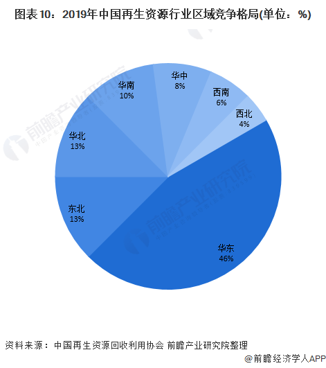 在區(qū)域競爭格局方面,從2019年我國再生資源行業(yè)50強(qiáng)企業(yè)的注冊(cè)地分布來看,華東地區(qū)的上榜企業(yè)數(shù)量最多,占比達(dá)46%,其中江蘇省的競爭實(shí)力最強(qiáng)。