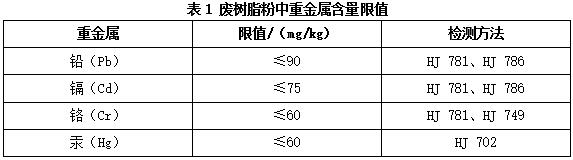 6.3.2.5企業(yè)應對每批綜合利用的廢樹脂粉中重金屬的含量(如鉛、鎘、鉻、汞等)進行檢測,重金屬的限值與檢測方法按表1規(guī)定的執(zhí)行。利用廢樹脂粉生產(chǎn)建材的,再生產(chǎn)物除滿足國家、地方制定或行業(yè)通行的產(chǎn)品質(zhì)量標準外,其中有害物質(zhì)含量及浸出限值應執(zhí)行HJ1091和GB 30760的要求。