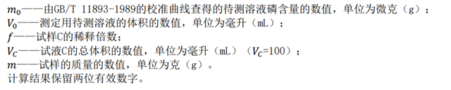試樣中總磷的含量以質(zhì)量分?jǐn)?shù)w2計(jì),按式(5)計(jì)算: