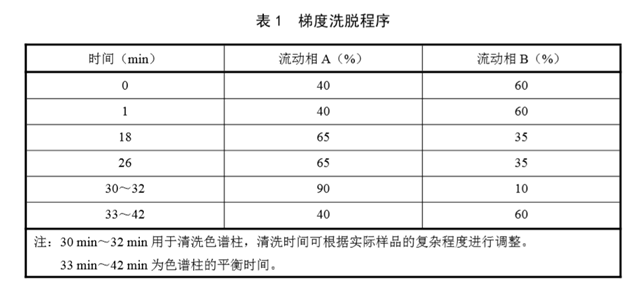 根據(jù)樣品中目標(biāo)化合物與標(biāo)準(zhǔn)系列中目標(biāo)化合物的保留時間進(jìn)行定性,可采用標(biāo)準(zhǔn)加入法、不 同波長下的吸收比或掃描紫外吸收光譜等方法輔助定性。必要時,可采用高效液相色譜-三重四極桿質(zhì)譜法對目標(biāo)化合物進(jìn)行確認(rèn)。7種除草劑的離子對和多離子監(jiān)測條件參見附錄B。