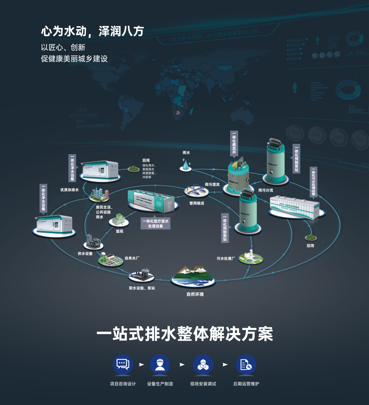 為響應(yīng)國家綠水青山就是金山銀山的號召,南方泵業(yè)致力于為客戶提供一站式的排水系統(tǒng)整體解決方案,推出一體化預(yù)制泵站、一體化污水處理設(shè)備及一體化智能截流井設(shè)備等產(chǎn)品,形成了從前端的項目咨詢、方案設(shè)計,到設(shè)備制造、現(xiàn)場安裝調(diào)試、設(shè)備后期運維管理于一體的服務(wù)體系?;ヂ?lián)網(wǎng)背景下,將排水設(shè)備產(chǎn)品與智能控制系統(tǒng)、智慧管理平臺相結(jié)合,對設(shè)備現(xiàn)場動態(tài)監(jiān)控,保證設(shè)備穩(wěn)定運行,通過大數(shù)據(jù)收集、故障預(yù)警與遠(yuǎn)程調(diào)度功能實現(xiàn)水務(wù)系統(tǒng)的智慧化運營管理。