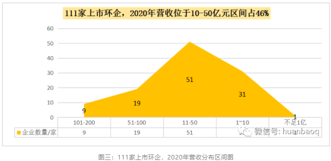 111家上市環(huán)企,2020年?duì)I收在51億元-100億元區(qū)間有19家,龍馬環(huán)衛(wèi)、興蓉環(huán)境首次擠進(jìn)50億元營(yíng)收陣營(yíng);而營(yíng)收在10億元-50億元區(qū)間的上市環(huán)企,有51家,約占半數(shù);營(yíng)收區(qū)間位于1億元-10億元的“小而美”上市環(huán)企,有31家,它們大多是科創(chuàng)板企業(yè)(如圖三所示)。