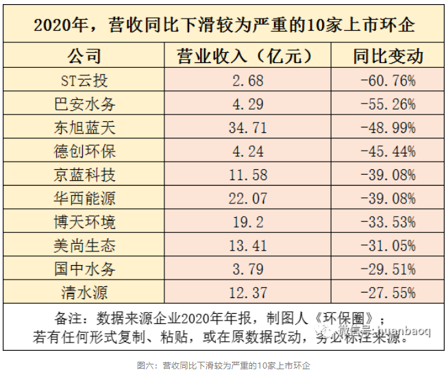 相比上述企業(yè)的出彩表現(xiàn),接下來(lái)圖六表格中的ST云投、巴安水務(wù)、東旭藍(lán)天、華西能源、國(guó)中水務(wù)、清水源等10家上市環(huán)企的表現(xiàn)則不盡如意,2020年?duì)I業(yè)收入下滑較為嚴(yán)重,降幅最大的前三分別是ST云投、巴安水務(wù)、東旭藍(lán)天。