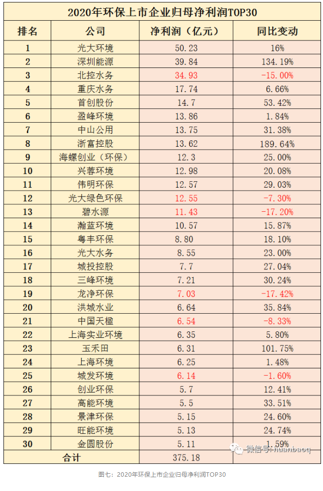 不過(guò),TOP30強(qiáng)中,像業(yè)內(nèi)比較熟悉明星上市環(huán)企,北控水務(wù)、光大綠色環(huán)保、碧水源、龍凈環(huán)保、中國(guó)天楹、城發(fā)環(huán)境等,2020年歸母凈利潤(rùn)都遭到不同程度下滑。