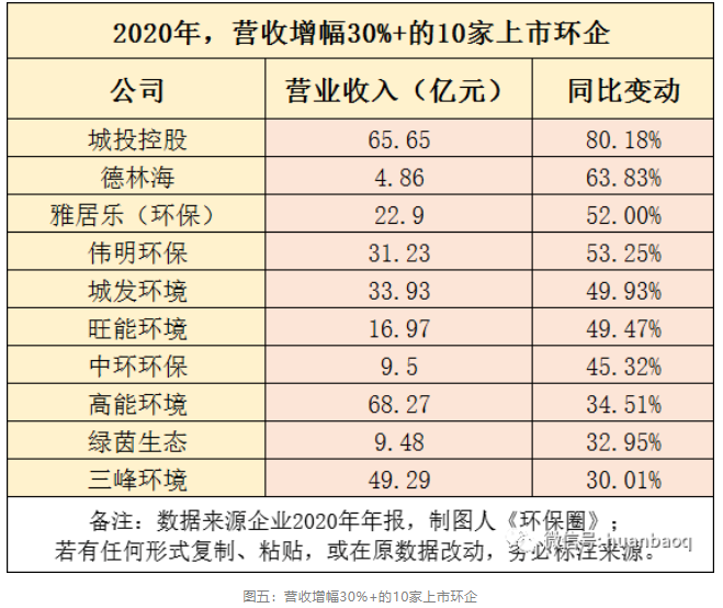 就營(yíng)收增速而言,2020年,111家環(huán)保上市企業(yè)營(yíng)收增速30%以上的,只有為數(shù)不多的10家。(如圖五所示)2019年這個(gè)數(shù)字還是23家,同比下降了56%。城投控股、德林海、雅居樂(lè)(環(huán)保)、城發(fā)環(huán)境、旺能環(huán)境、中環(huán)環(huán)保、高能環(huán)境、綠茵生態(tài)、三峰環(huán)境等企業(yè)都在高增長(zhǎng)之列,而且這些企業(yè)從事業(yè)務(wù)大都與固廢相關(guān)。