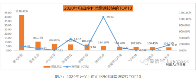 在外界宏觀條件不利、疫情生死攸關(guān)的2020年,仍有一些上市環(huán)企脫穎出來(lái),從凈利潤(rùn)增速來(lái)看,2020年增速較快TOP10上市環(huán)企非常有看點(diǎn)(如圖八所示)。