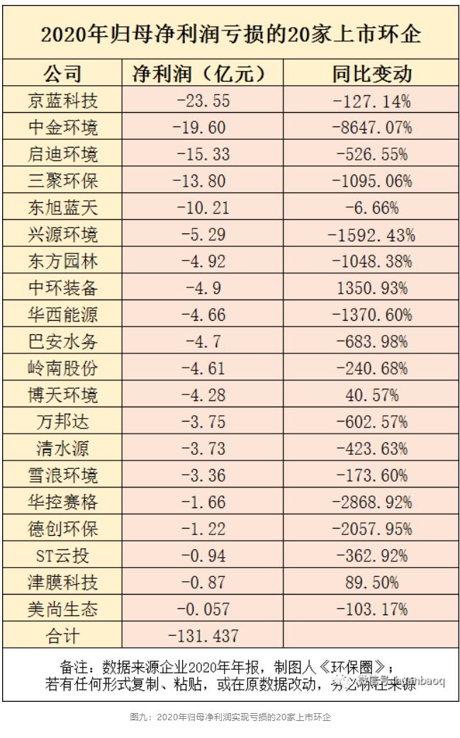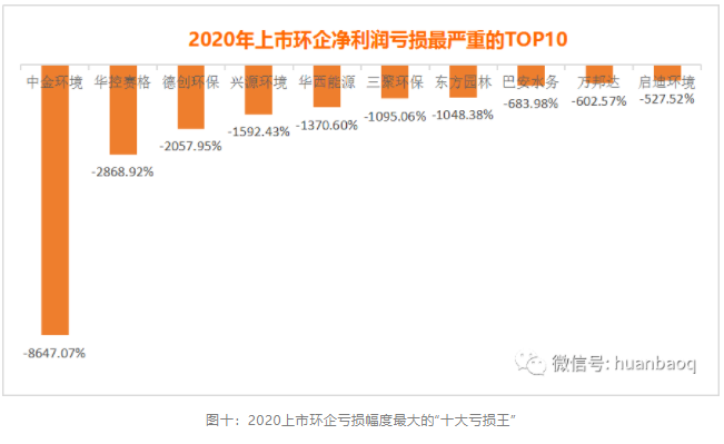 如果要在這20家虧損企業(yè)中,找到2020上市環(huán)企虧損幅度最大的“十大虧損王”,如圖十所示中金環(huán)境、德創(chuàng)環(huán)保、華控賽格、興源環(huán)境、三聚環(huán)保、東方園林、巴安水務(wù)、萬(wàn)邦達(dá)、啟迪環(huán)境、清水源都“榜上有名”。