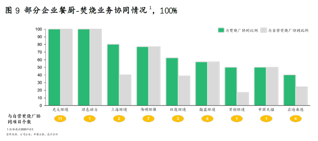 在垃圾分類全面推行的大背景下,這些大型固廢企業(yè)正利用協(xié)同優(yōu)勢降維打擊(見圖9)。一方面,垃圾焚燒主業(yè)帶給這些企業(yè)資金和政府資源雙重優(yōu)勢;另一方面,協(xié)同處置帶來降本增效,可以幫助這些企業(yè)降低財務壓力:在收入端,協(xié)同優(yōu)勢在于餐廚沼渣余電上網(wǎng);而在成本端,除可節(jié)約土建、人工等成本外,干濕垃圾處置的發(fā)電設備、除臭系統(tǒng)、滲濾液處理系統(tǒng)、蒸汽供熱系統(tǒng)等也可共用,從而降低折舊攤銷成本。