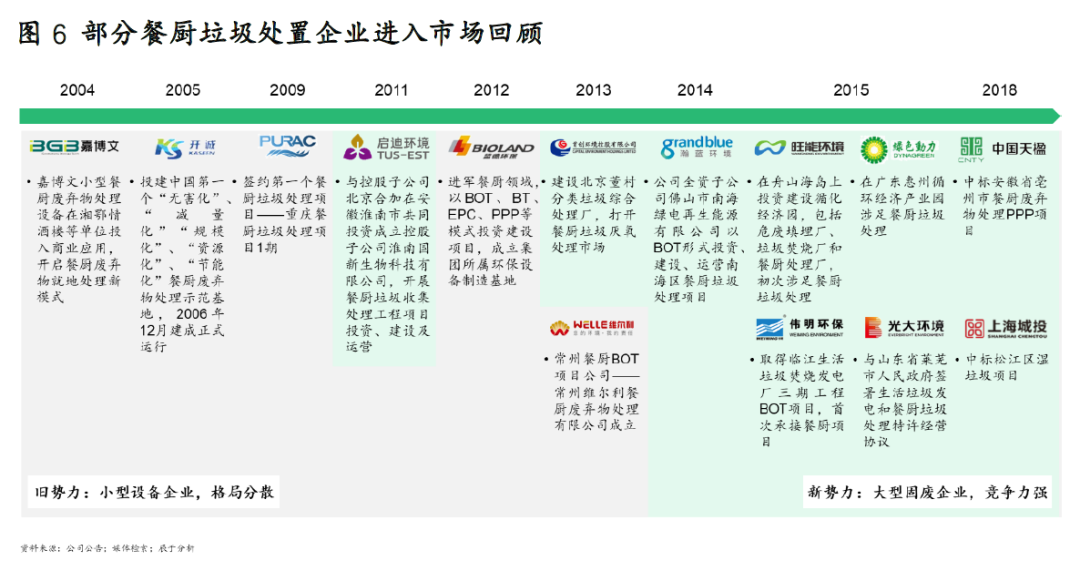 回顧我國餐廚垃圾處理行業(yè)的發(fā)展歷程,可以看到過去十幾年由于市場規(guī)模小、發(fā)展慢,并未引起足夠重視,主要是一些小型設備企業(yè)“小打小鬧”,市場比較分散,競爭并不激烈。不過近幾年,隨著垃圾分類帶來的需求激增,包括光大環(huán)境、中國天楹、上海城投等大型固廢企業(yè)紛紛進入,硝煙四起(見圖6)。