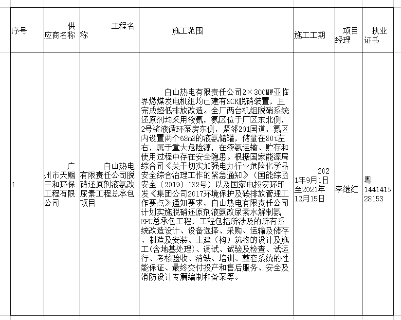 白山熱電有限責任公司脫硝還原劑液氨改尿素工程總承包項目中標結(jié)果公告