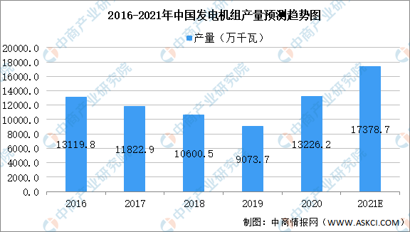 一般我們常見的發(fā)電機(jī)組通常由汽輪機(jī)、水輪機(jī)或內(nèi)燃機(jī)(汽油機(jī)、柴油機(jī)等發(fā)動(dòng)機(jī))驅(qū)動(dòng),可再生新能源包括核能、風(fēng)能、太陽(yáng)能、生物質(zhì)能、海洋能等。數(shù)據(jù)顯示,我國(guó)發(fā)電機(jī)組產(chǎn)量呈波動(dòng)趨勢(shì),2020年我國(guó)發(fā)電機(jī)組產(chǎn)量達(dá)13226.2萬(wàn)千瓦,預(yù)計(jì)2021年我國(guó)發(fā)電機(jī)組產(chǎn)量可達(dá)17378.7萬(wàn)千瓦。