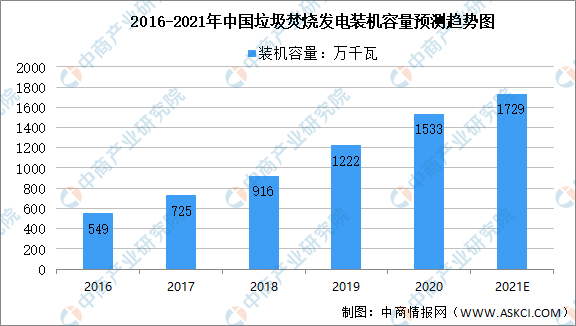 數(shù)據(jù)顯示,我國(guó)垃圾焚燒發(fā)電裝機(jī)容量由2016年549萬(wàn)千瓦增至2020年1533萬(wàn)千瓦,年均復(fù)合增長(zhǎng)率為29.27%。中商產(chǎn)業(yè)研究院預(yù)測(cè),2021年垃圾焚燒發(fā)電裝機(jī)容量可達(dá)1729萬(wàn)千瓦。