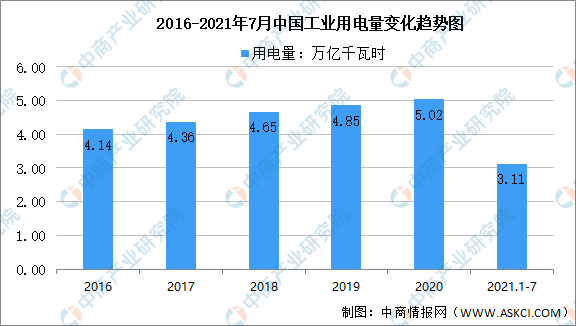 數(shù)據(jù)顯示,2021年1-7月,工業(yè)用電量達(dá)3.11萬(wàn)億千瓦時(shí)。第一產(chǎn)業(yè)用電量102億千瓦時(shí),同比增長(zhǎng)20.0%;第二產(chǎn)業(yè)用電量5068億千瓦時(shí),同比增長(zhǎng)9.3%;第三產(chǎn)業(yè)用電量1422億千瓦時(shí),同比增長(zhǎng)21.6%;其中,7月工業(yè)用電量達(dá)4972億千瓦時(shí)。