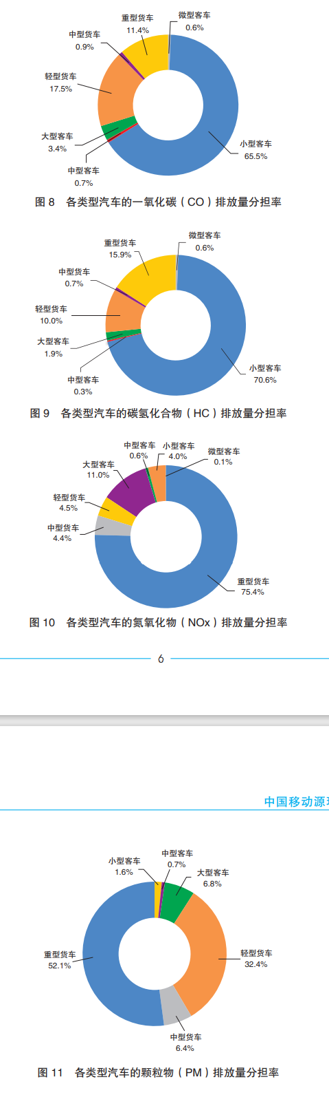 從車型上來看,4項(xiàng)污染物排放分擔(dān)率,一氧化碳(CO)、碳?xì)浠衔?HC)占比最大的均為小型客車,分別達(dá)到65.5%、70.6%;氮氧化物(NOx)、顆粒物(PM)占比最大的則為重型貨車,達(dá)到75.4%和52.1%。