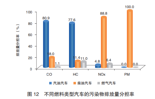 從燃料類型上看,4項(xiàng)污染物排放分擔(dān)率,一氧化碳(CO)、碳?xì)浠衔?HC)占比最大的為汽油汽車;氮氧化物(NOx)、顆粒物(PM)則為柴油汽車。其中,柴油類汽車在PM排放分擔(dān)率上達(dá)到100%。