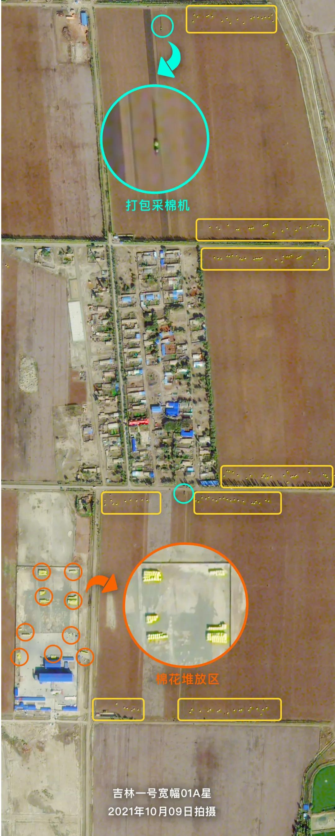 金秋時(shí)節(jié),新疆各地棉花陸續(xù)進(jìn)入采收期。吉林一號(hào)衛(wèi)星從太空記錄下了新疆昌吉回族自治州阜康市機(jī)械化采收棉花的忙碌場(chǎng)景,壓縮打包完成的棉花卷堆積在棉田周?chē)诘却\(yùn)輸。