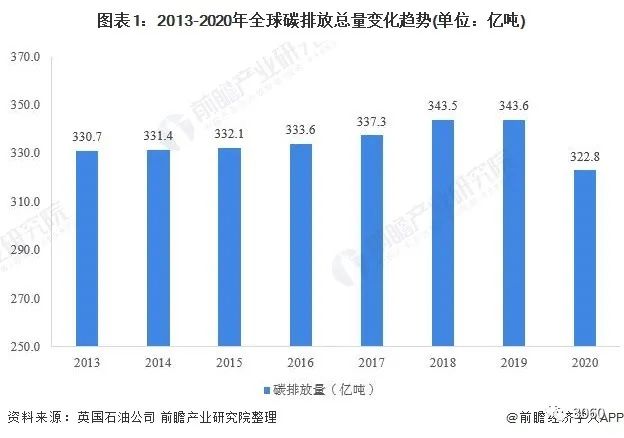 21世紀(jì)以來(lái),全球碳排放量增長(zhǎng)迅速,2000-2019年,全球二氧化碳排放量增加了40%。據(jù)英國(guó)石油公司(BP)發(fā)布的《世界能源統(tǒng)計(jì)年鑒(第70版)》統(tǒng)計(jì)數(shù)據(jù)顯示,2013年以來(lái),全球碳排放量保持持續(xù)增長(zhǎng),2019年,全球碳排放量達(dá)343.6億噸,創(chuàng)歷史新高。2020年,受全球新冠肺炎影響,世界各地區(qū)碳排放量普遍減少,全球碳排放量下降至322.8億噸,同比下降6.3%。