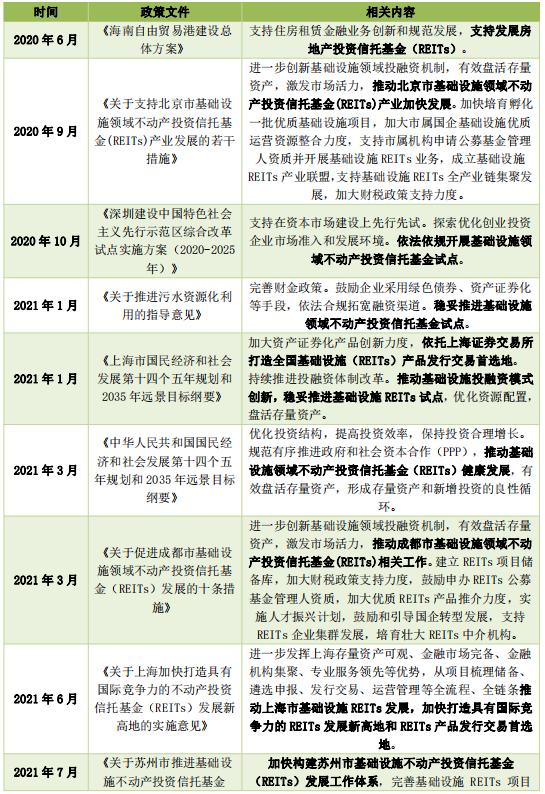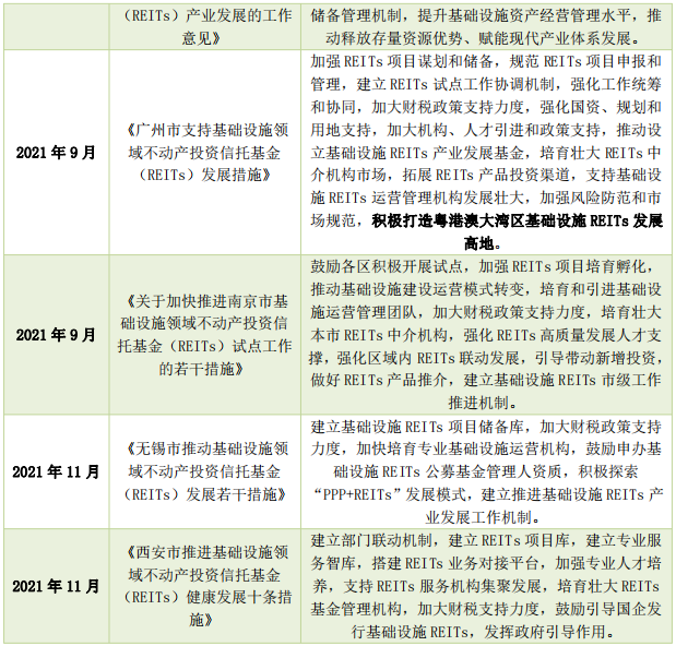 另外,中央、地方政府出臺的部分政策文件、省市區(qū)域的遠景規(guī)劃也將REITs列為重要內(nèi)容之一,推動REITs在重點省份、城市與行業(yè)的應用和推廣。部分核心一、二線城市如北京、上海、成都、蘇州也相繼推出促進本市及所在區(qū)域的基礎設施REITs發(fā)展的政策或實施措施,構建本市基礎設施REITs發(fā)展工作體系,推動地方基礎設施REITs健康持續(xù)發(fā)展。