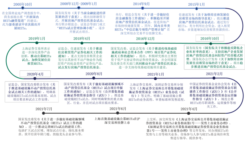 之后2021年1月,上海證券交易所、深圳證券交易所分別發(fā)布《上海證券交易所公開募集基礎設施證券投資基金(REITs)業(yè)務辦法(試行)》、《深圳證券交易所公開募集基礎設施證券投資基金(REITs)業(yè)務辦法(試行)》等文件,明確了基礎設施公募REITs的業(yè)務流程、審查標準和發(fā)售流程。中國證券業(yè)協(xié)會發(fā)布《公開募集基礎設施證券投資基金網(wǎng)下投資者管理細則》,規(guī)范網(wǎng)下投資者參與基礎設施公募REITs網(wǎng)下詢價和認購業(yè)務。4月,上交所、深交所公布關于REITs業(yè)務辦理指南,《上海證券交易所公開募集基礎設施證券投資基金(REITs)業(yè)務指南第1號——發(fā)售上市業(yè)務辦理》、《深圳證券交易所公開募集基礎設施證券投資基金業(yè)務指南第1號——發(fā)售上市業(yè)務辦理》等文件發(fā)布,對辦理REITs的發(fā)售與上市等相關業(yè)務、市場參與人參與REITs基金詢價和發(fā)售進行指導、提供參考。6月,首批基礎設施公募REITs產(chǎn)品在滬深交易所正式掛牌上市。7月,國家發(fā)改委發(fā)布《關于進一步做好基礎設施領域不動產(chǎn)投資信托基金(REITs)試點工作的通知》,進一步推動完善REITs試點的建設工作,包括擴大試點區(qū)域、增加試點行業(yè)、細化基本要求等。