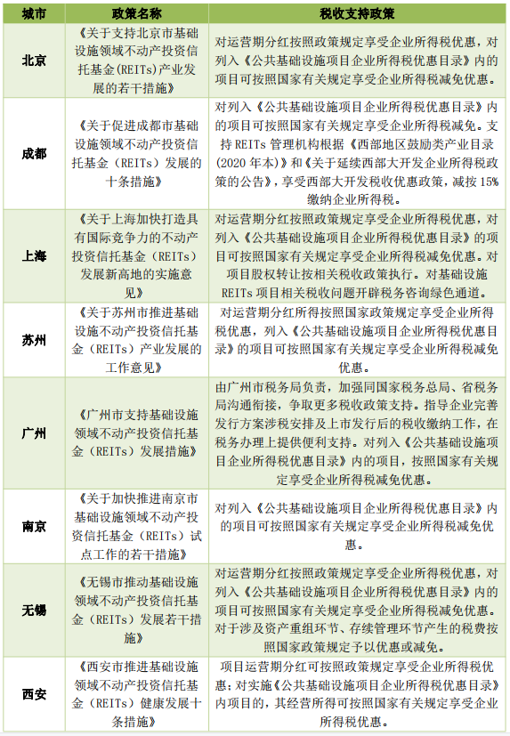 值得關注的是,在北京、上海、成都等城市發(fā)布的REITs推動政策或實施措施已經(jīng)開始關注REITs稅收問題,并出臺了針對性地稅收支持政策助力REITs發(fā)行與持有。包括對基礎設施REITs項目相關稅收問題開辟稅務咨詢綠色通道;在資產(chǎn)重組環(huán)節(jié)產(chǎn)生稅費予以優(yōu)惠;在運營期對項目公司及管理機構經(jīng)營所得予以所得稅優(yōu)惠;在分紅環(huán)節(jié)對于投資者分紅予以所得稅優(yōu)惠等。